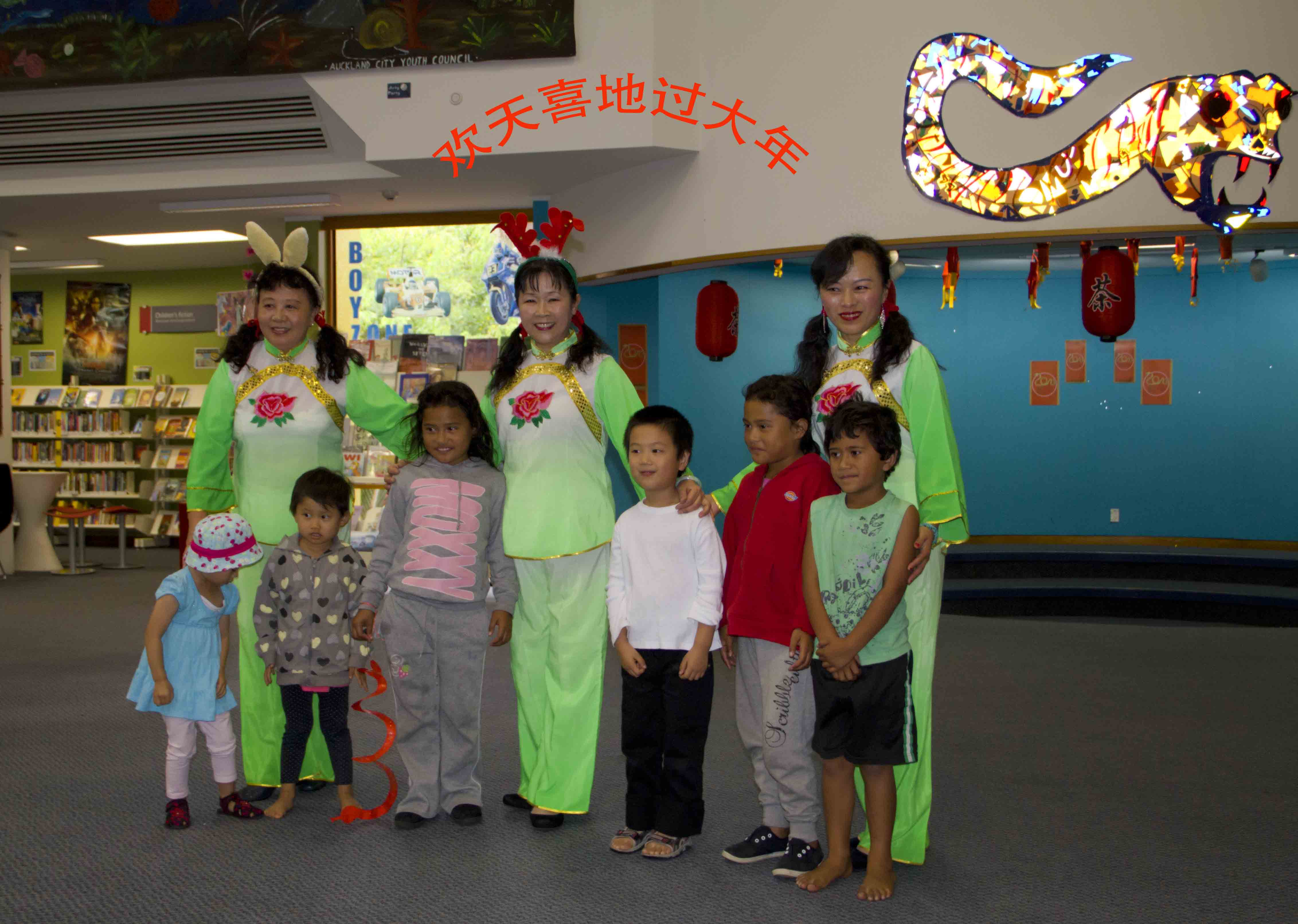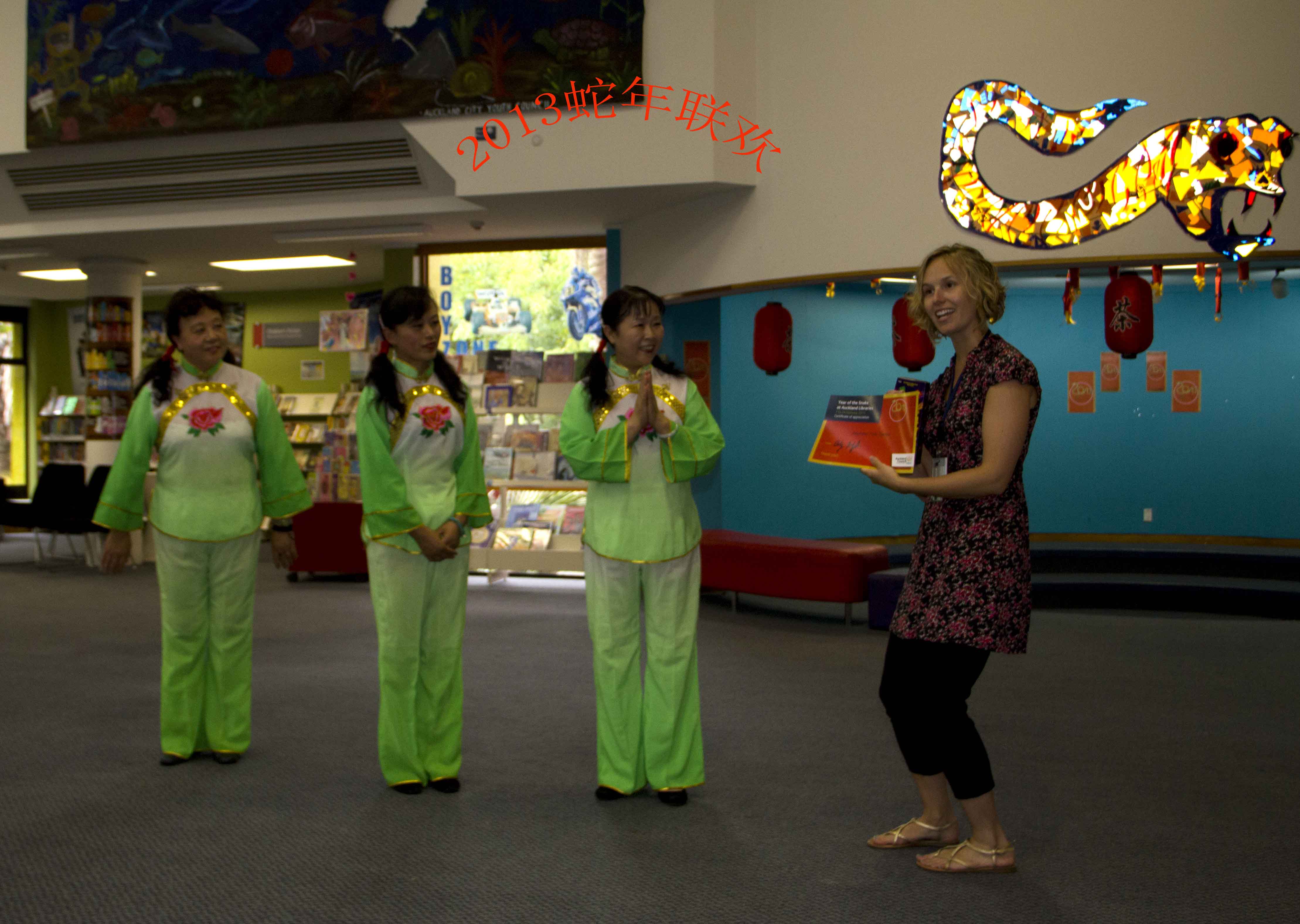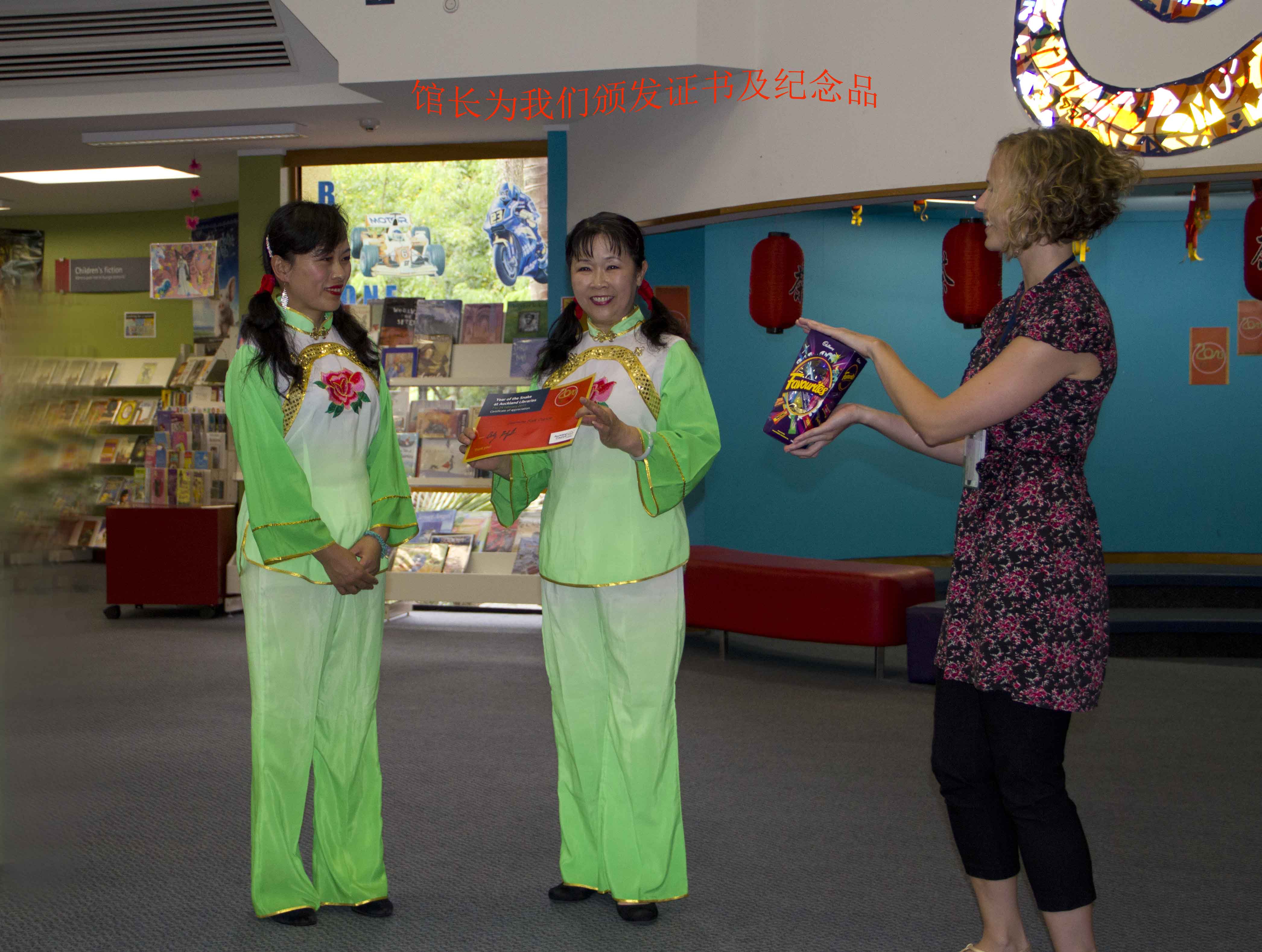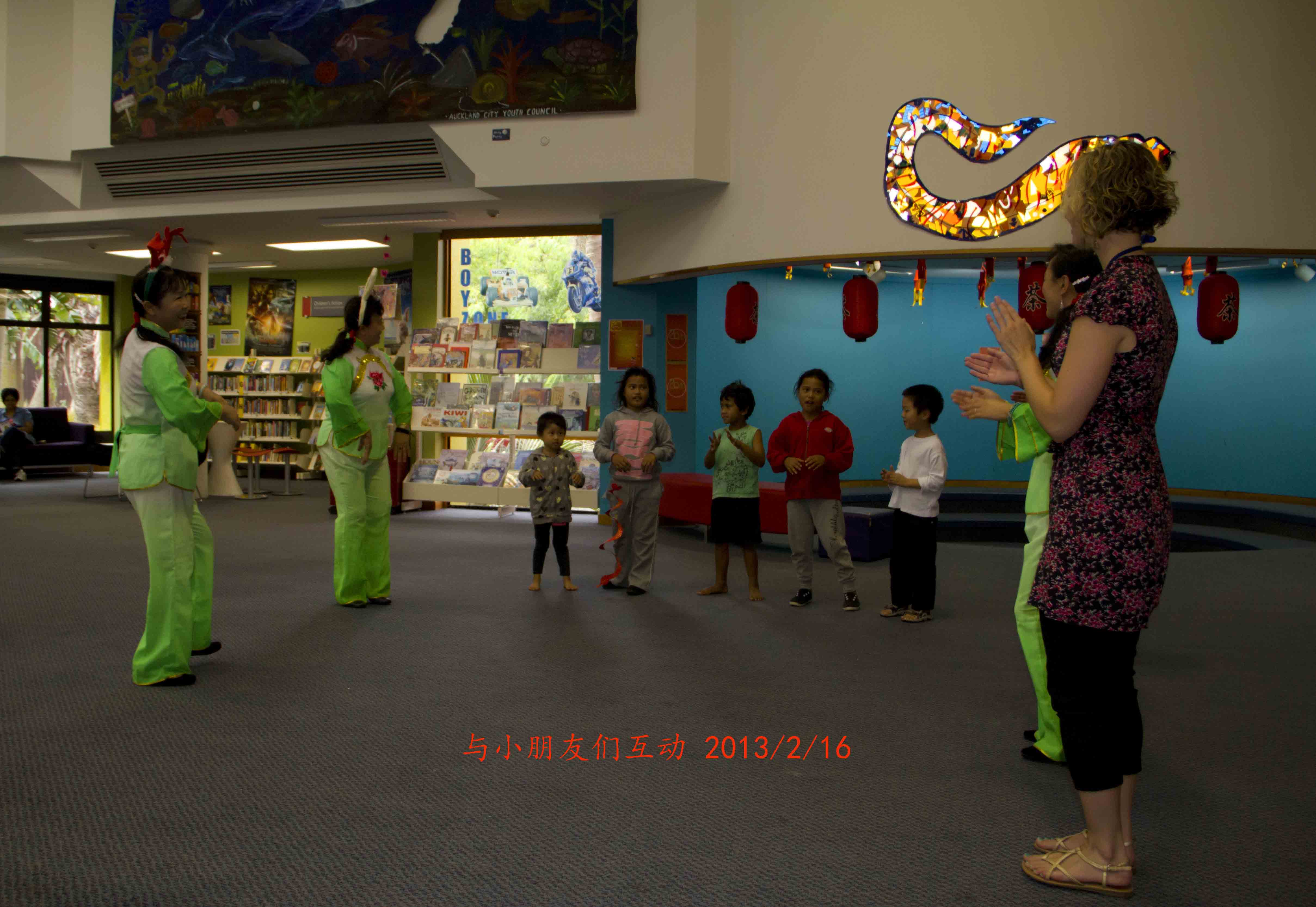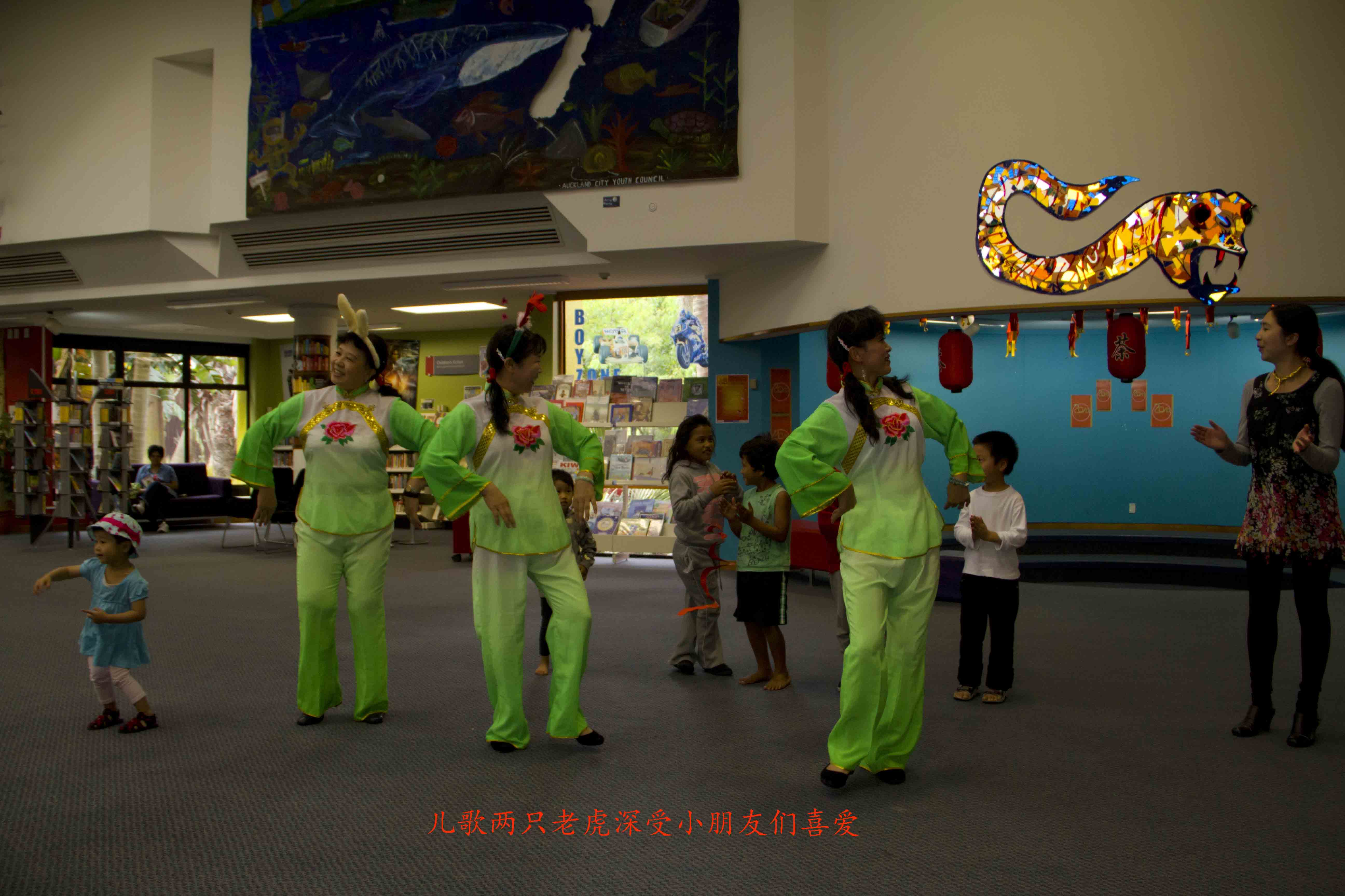 奥克兰的图书馆处处展示中国元素 中国年在奥克兰深入人心。Panmure图书馆蛇年联欢活动一角: 我们表演了舞蹈《好运来》以表达对图书馆的答谢。馆长亲自为我们颁发证书及纪念品。我们与小朋友互动中国儿歌《两只老虎》