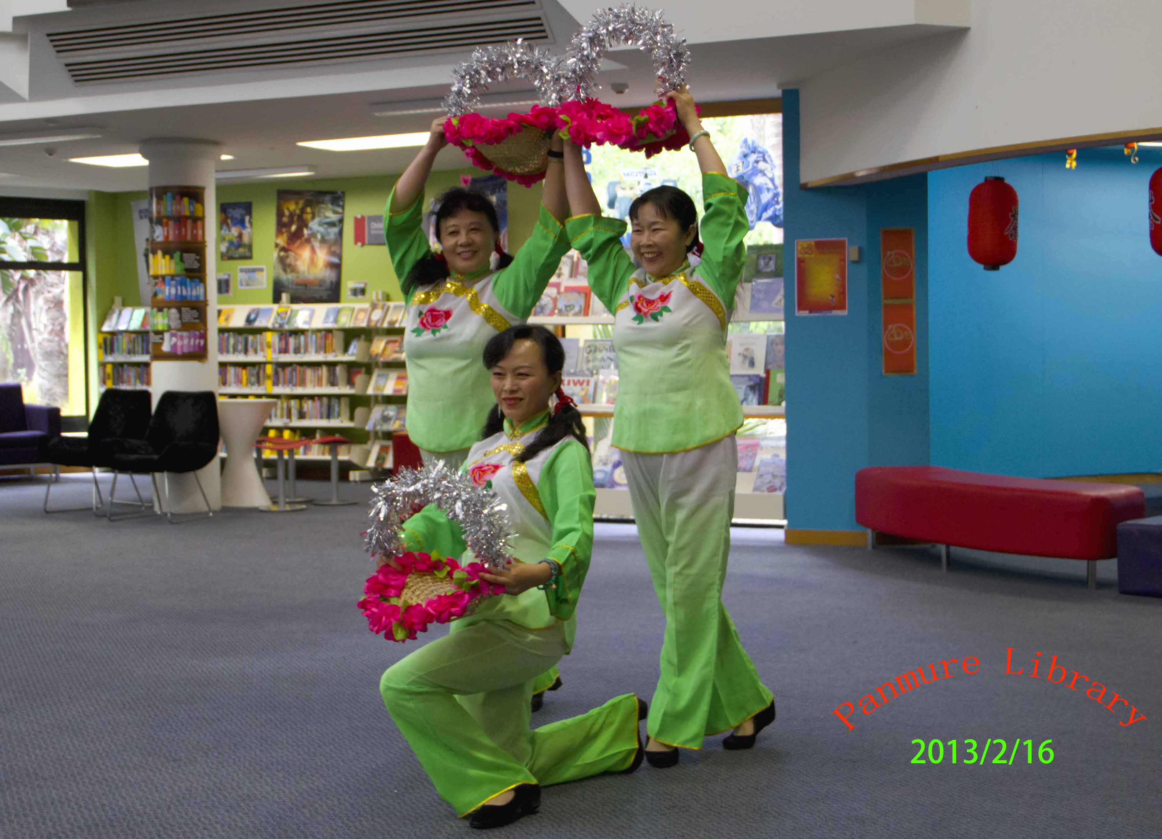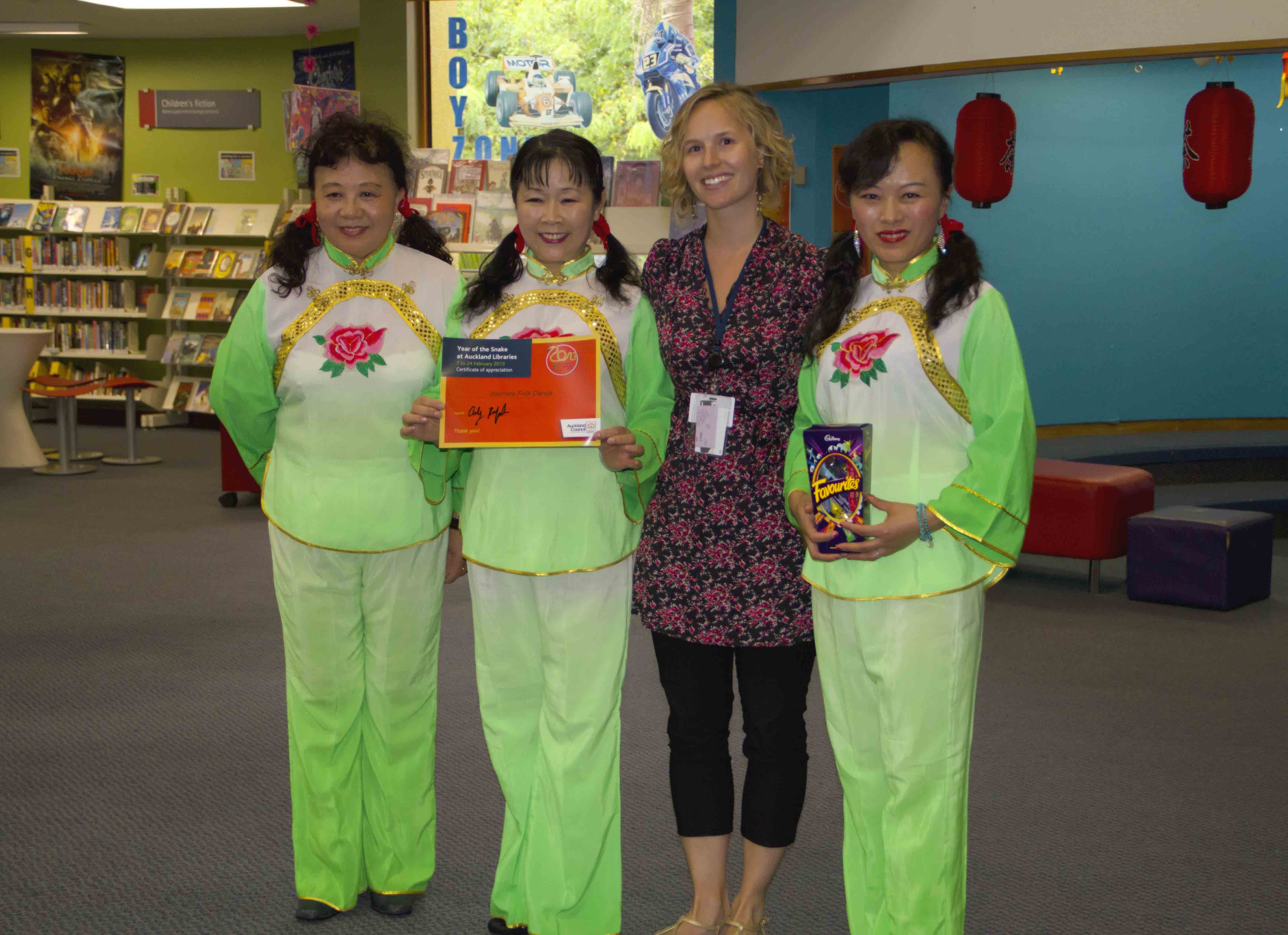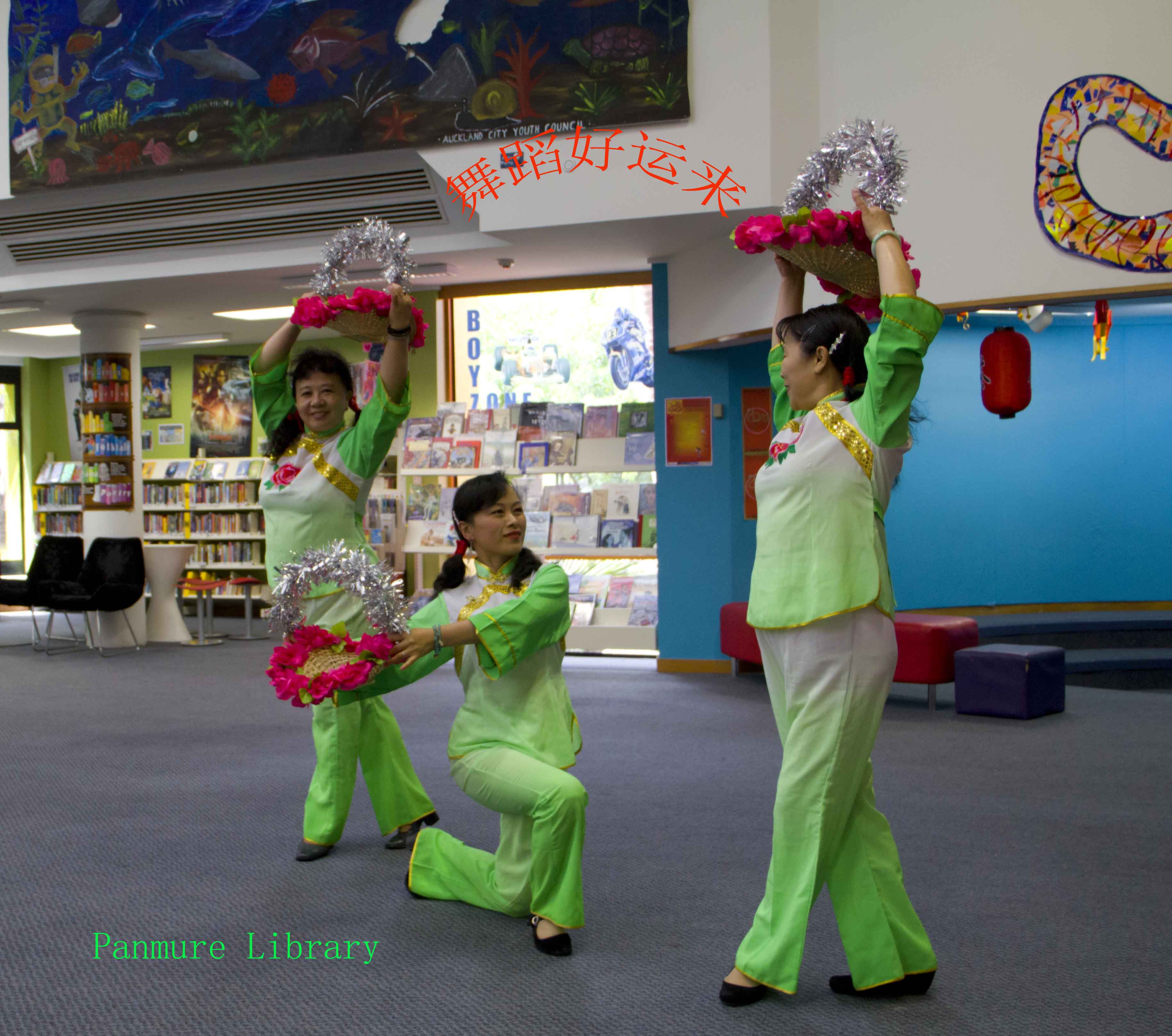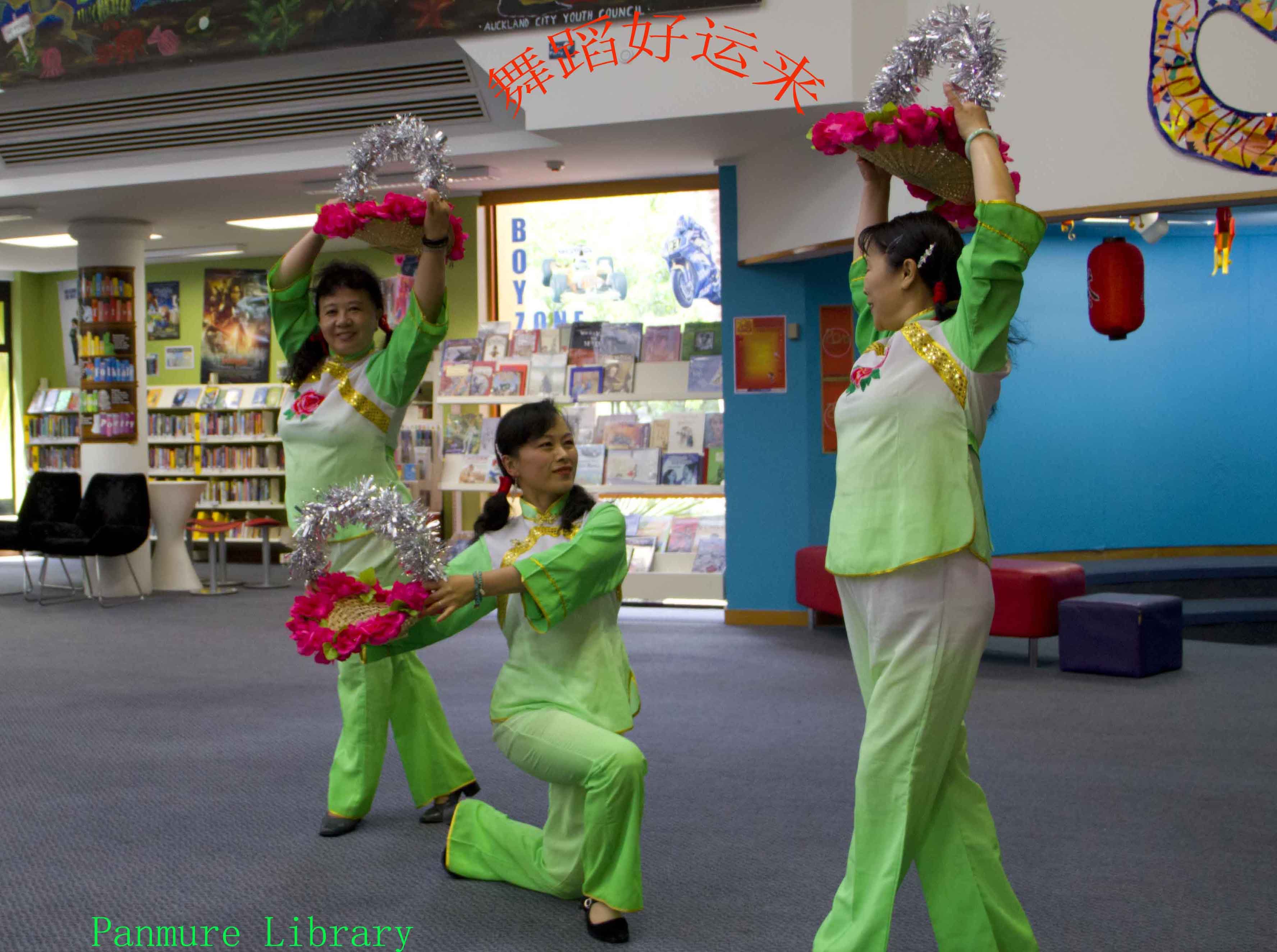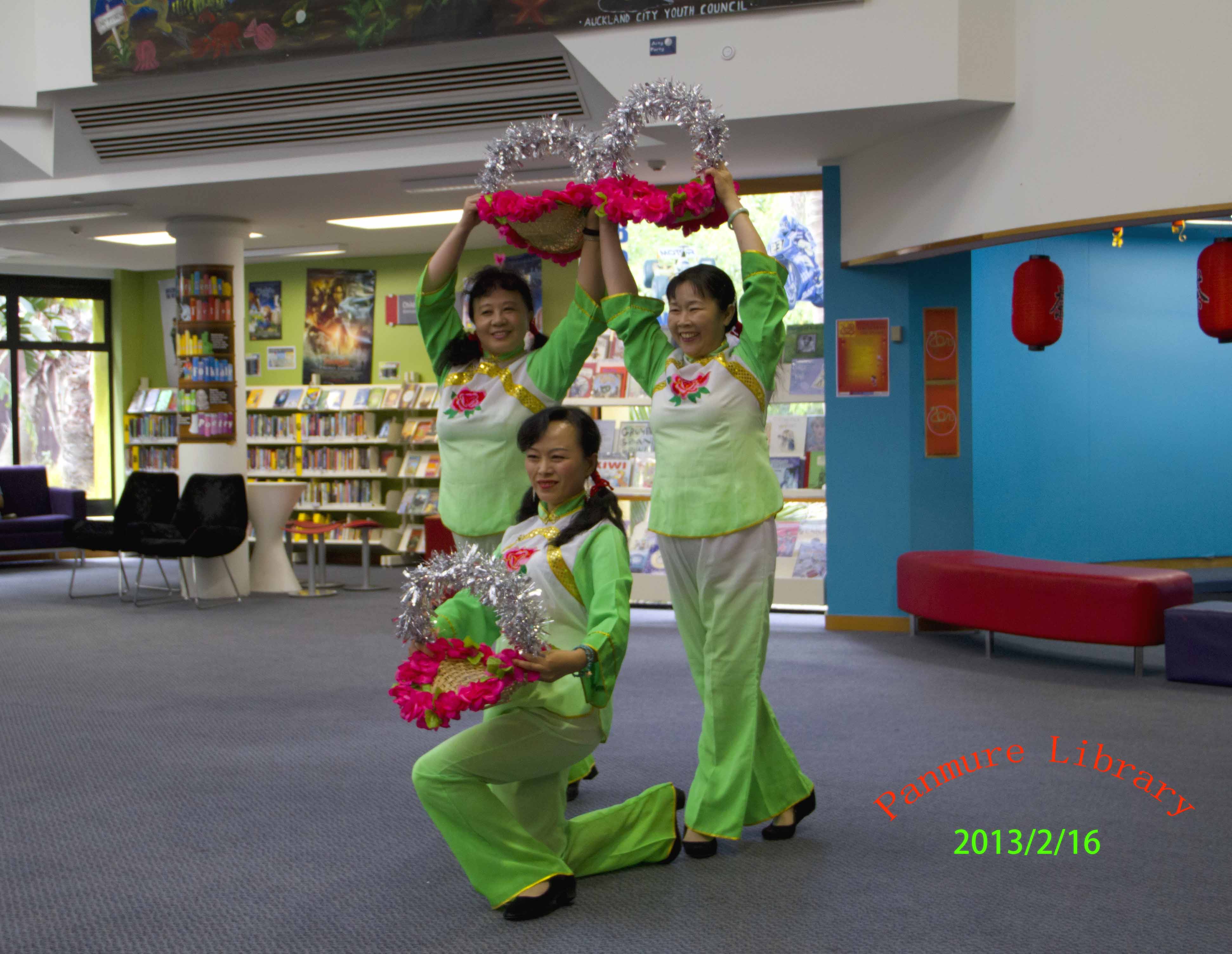 奥克兰的图书馆处处展示中国元素 中国年在奥克兰深入人心。Panmure图书馆蛇年联欢活动一角: 我们表演了舞蹈《好运来》以表达对图书馆的答谢。馆长亲自为我们颁发证书及纪念品。我们与小朋友互动中国儿歌《两只老虎》