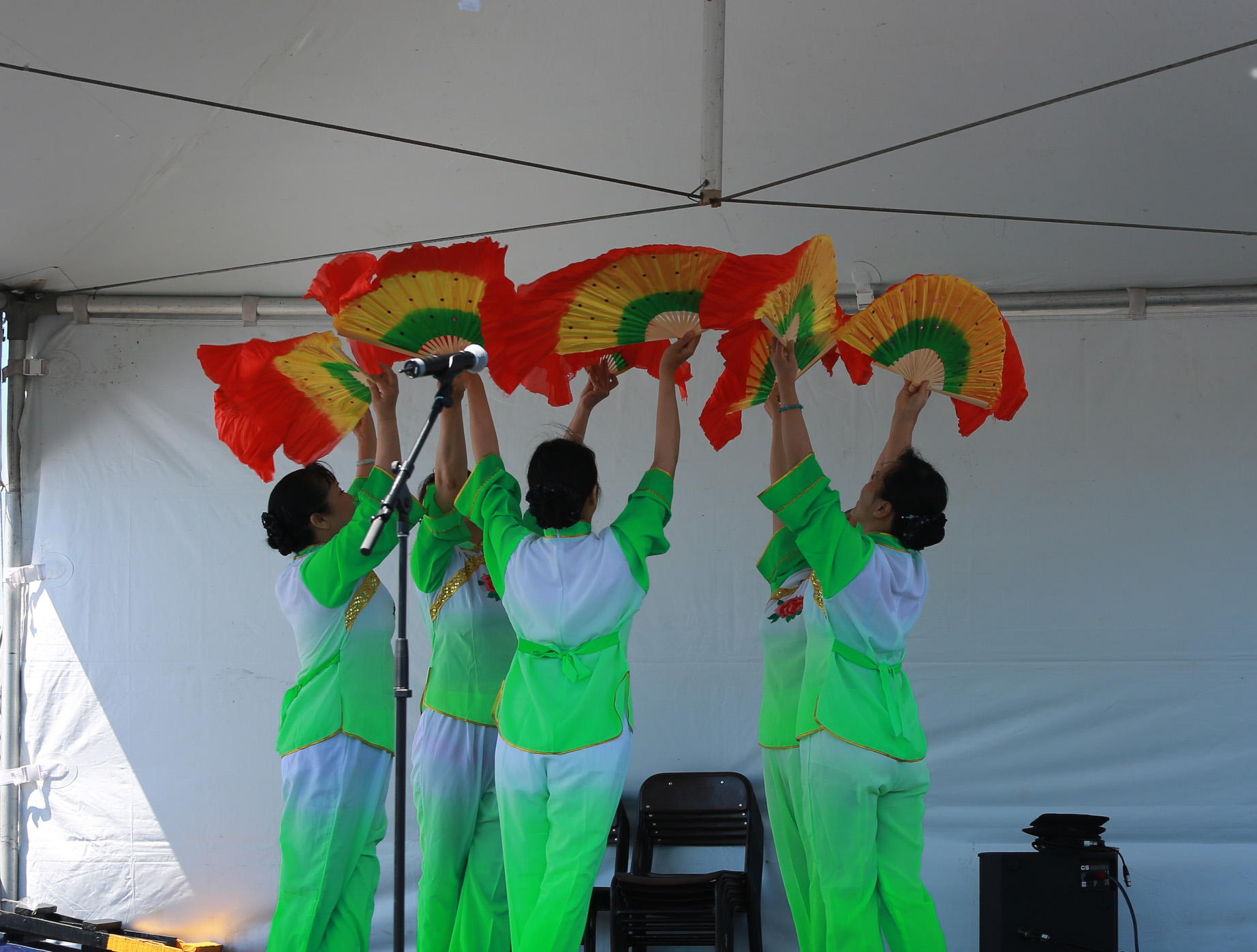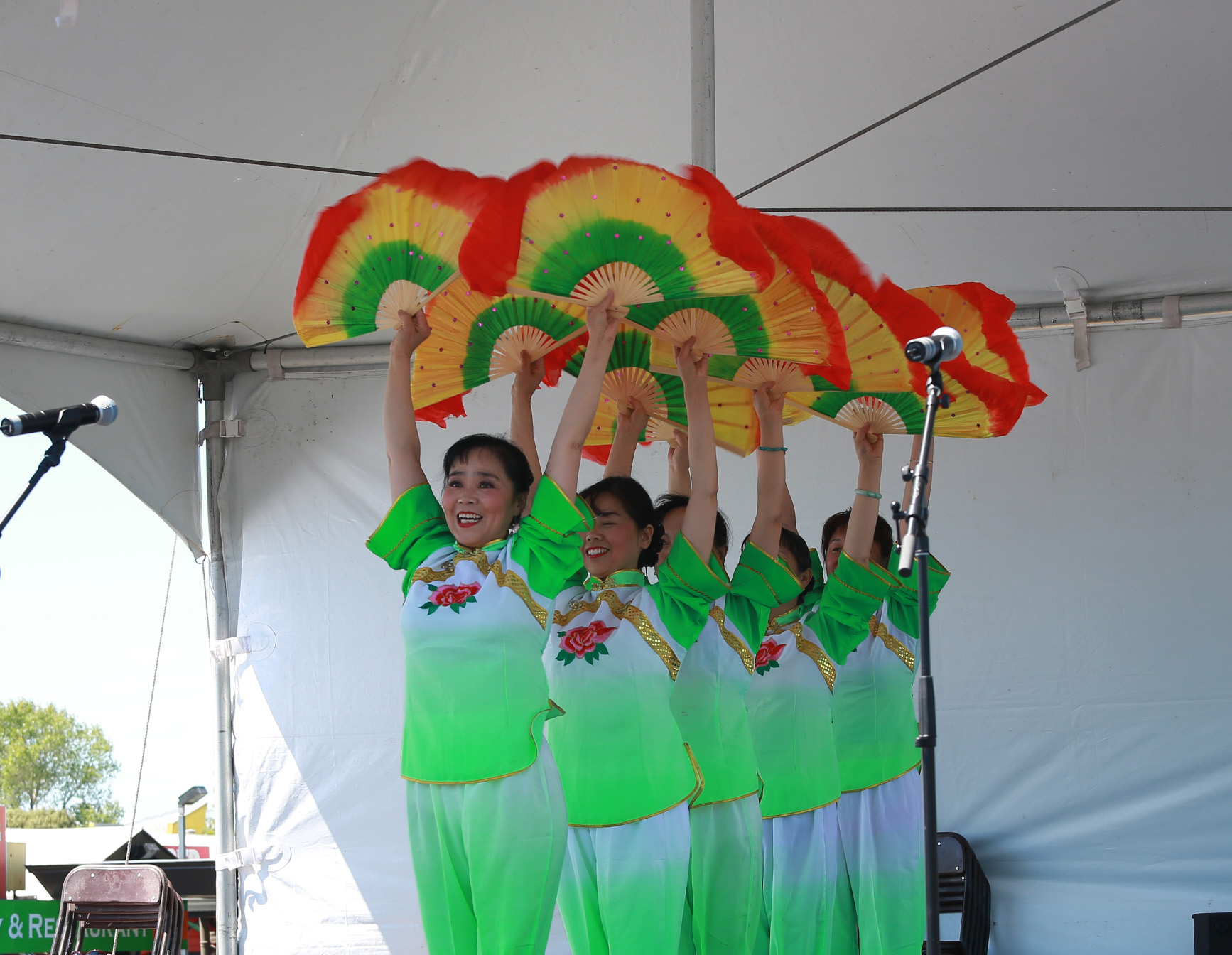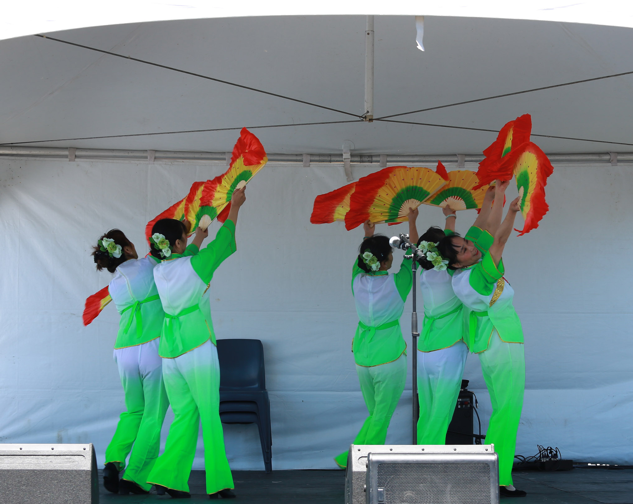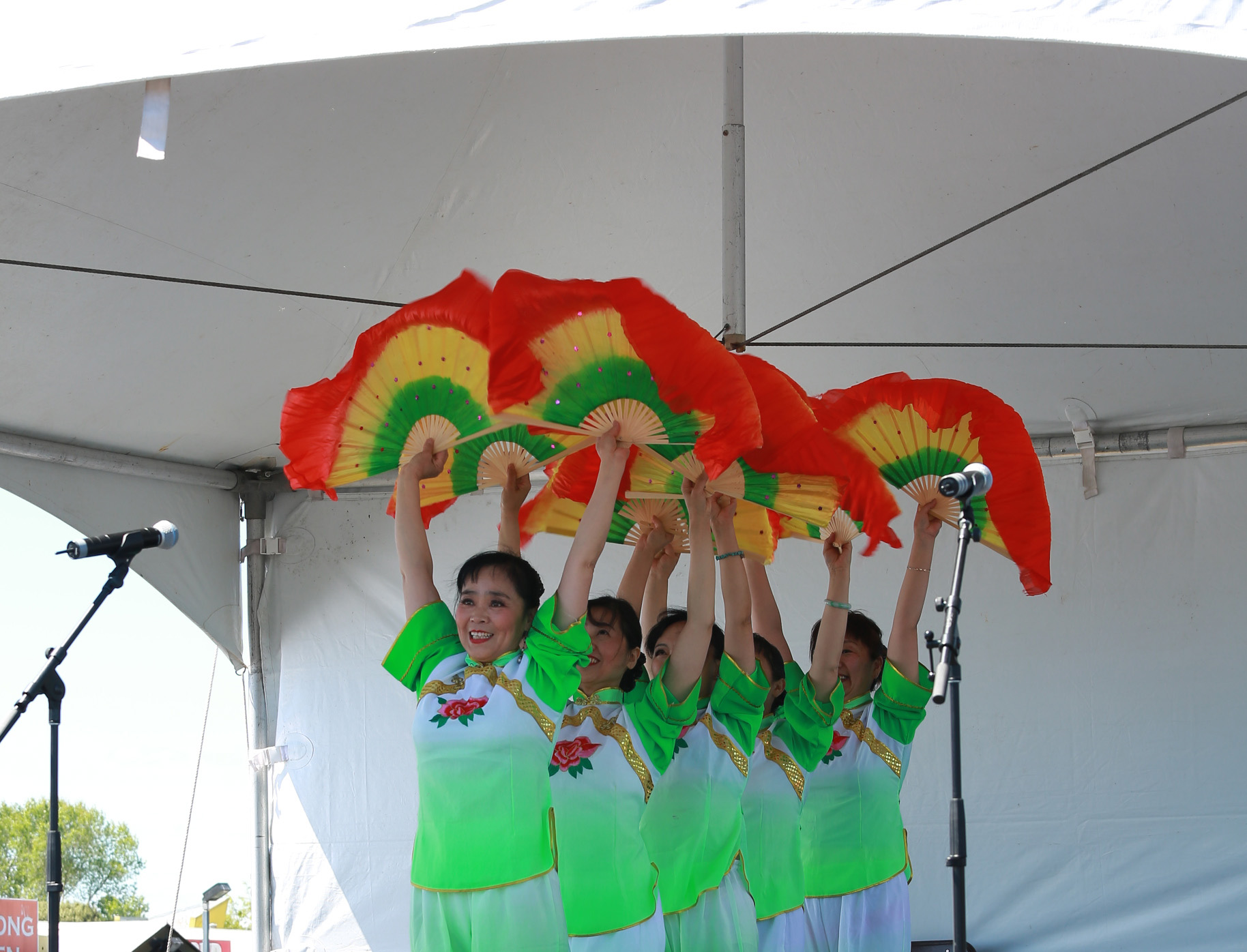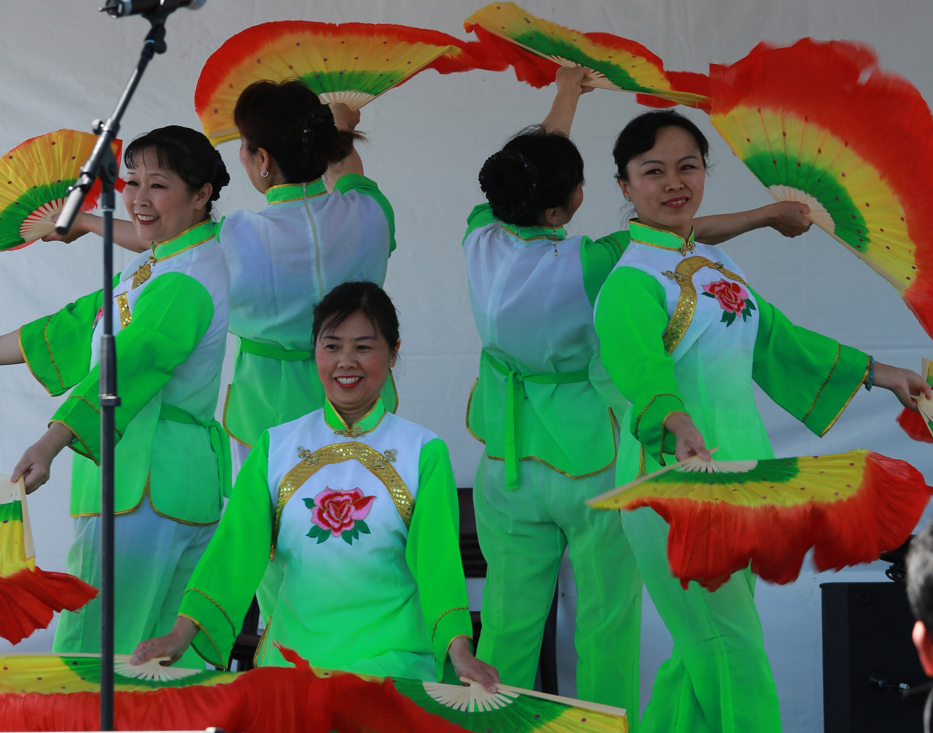 茉莉花首次亮相嘉年华,组织者邀请我们返场 ,姐妹们很兴奋. 第一次使用我们的新扇, 彩虹图案的双扇, 绿色服装阳光下艳丽夺目. 天空晴朗 风和日丽 五朵金花 美好心镜 旗开得胜 笑逐颜开 感谢李燕大姐的热情帮助