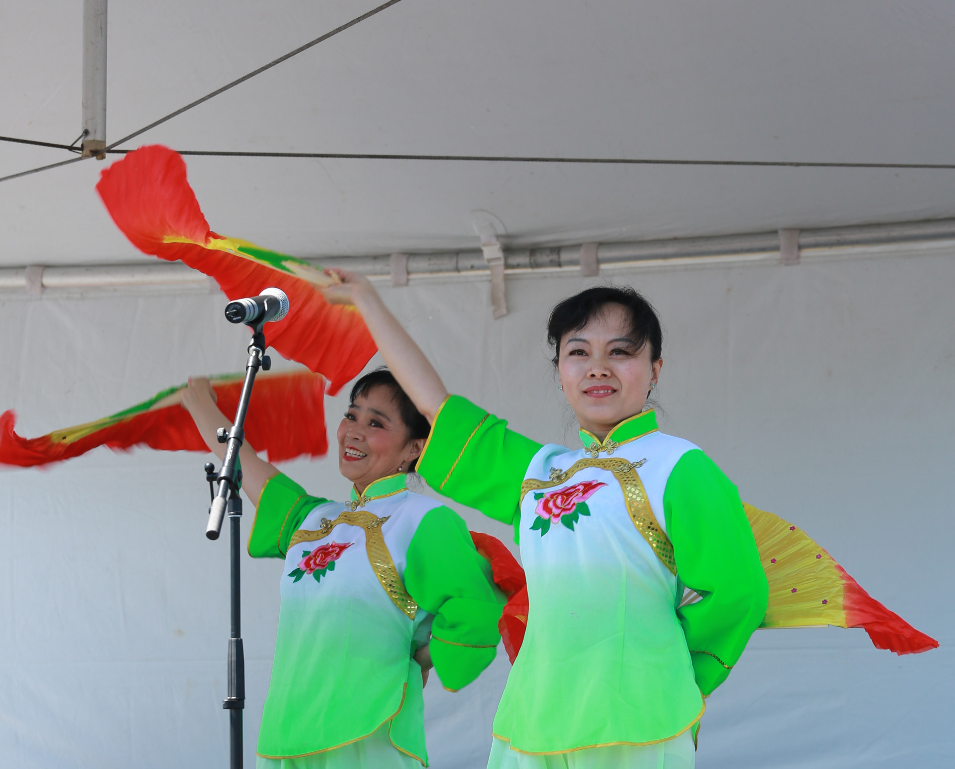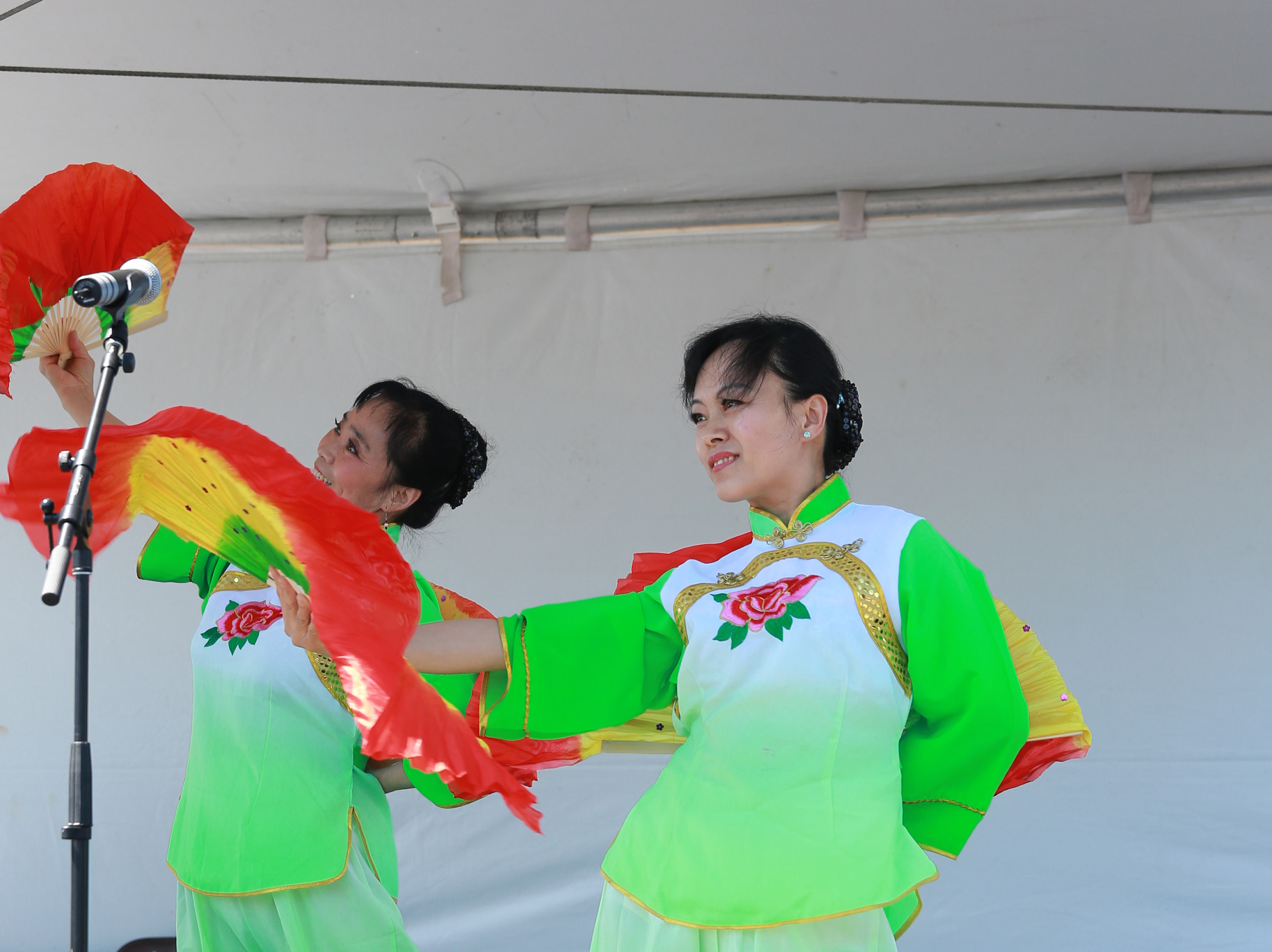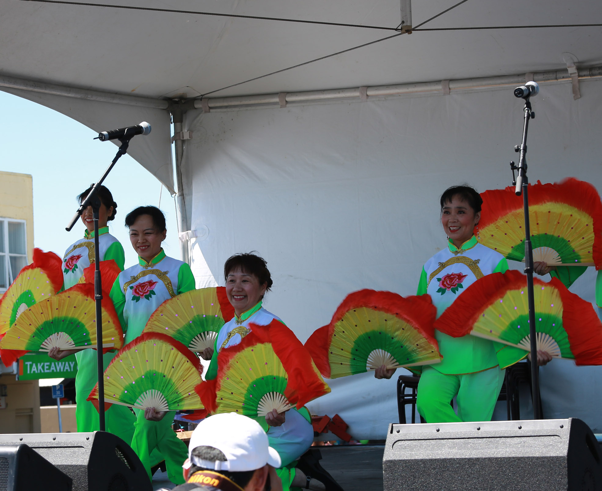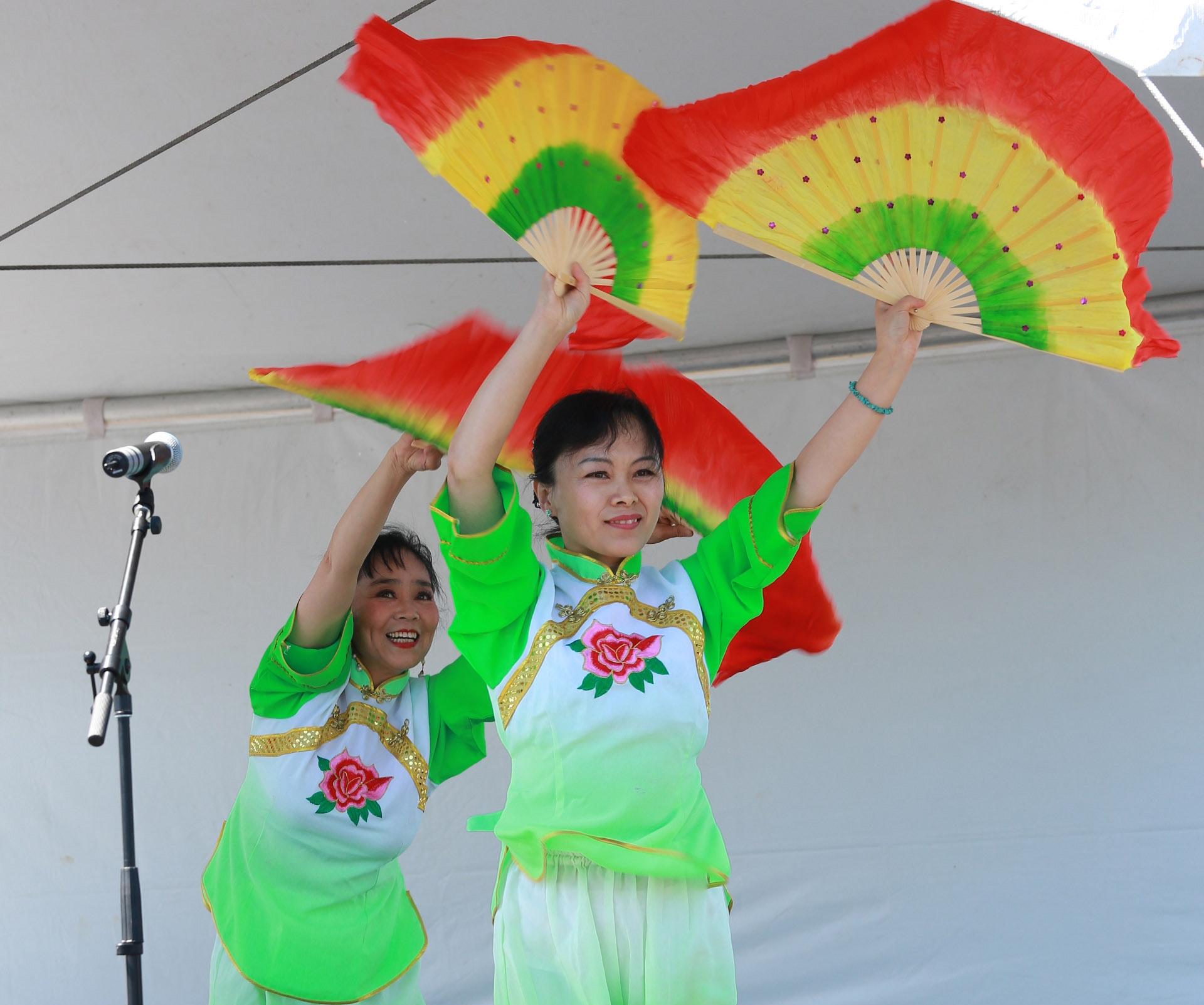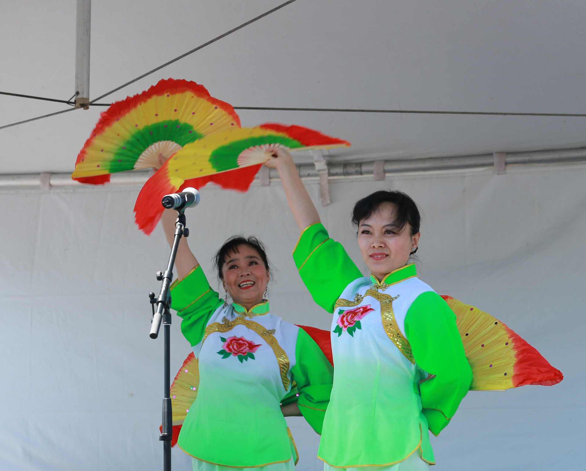 茉莉花首次亮相嘉年华,组织者邀请我们返场 ,姐妹们很兴奋. 第一次使用我们的新扇, 彩虹图案的双扇, 绿色服装阳光下艳丽夺目. 天空晴朗 风和日丽 五朵金花 美好心镜 旗开得胜 笑逐颜开 感谢李燕大姐的热情帮助